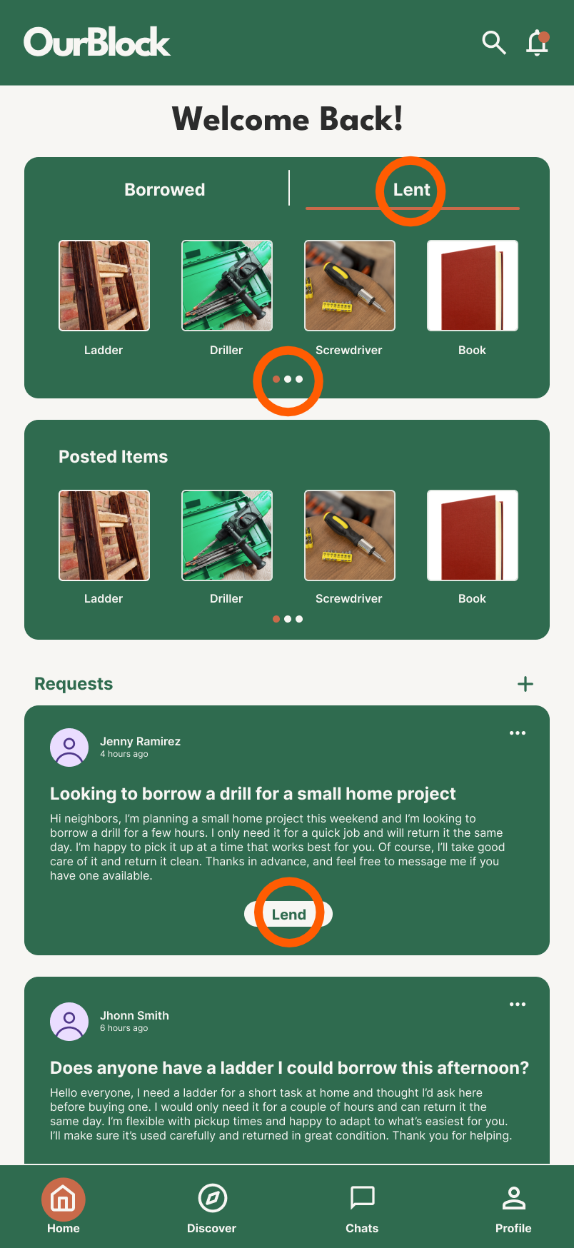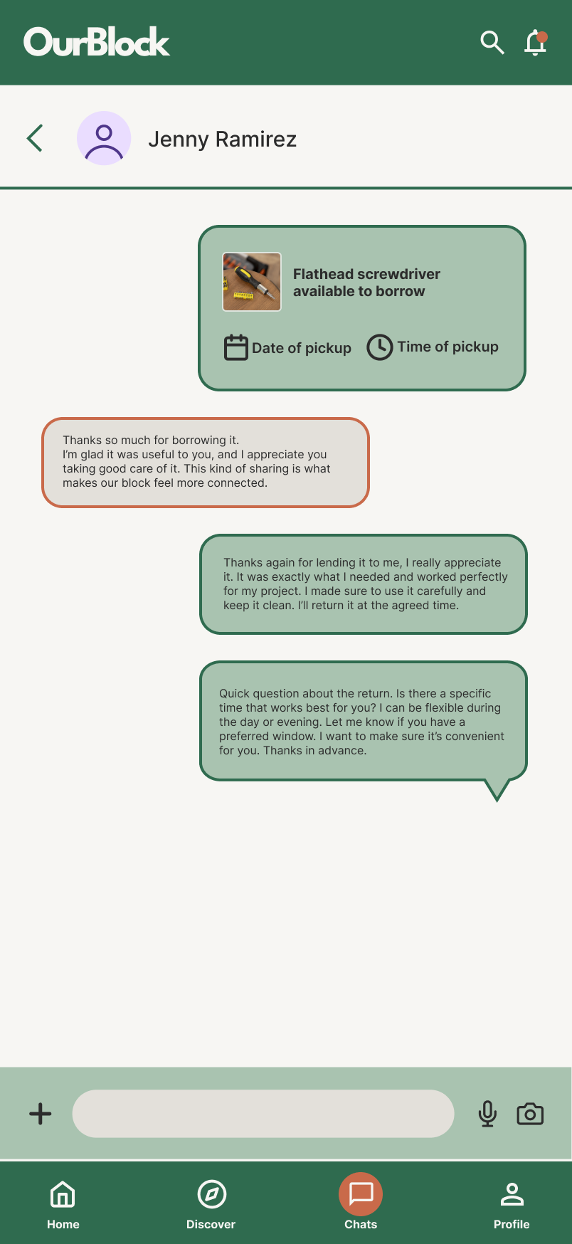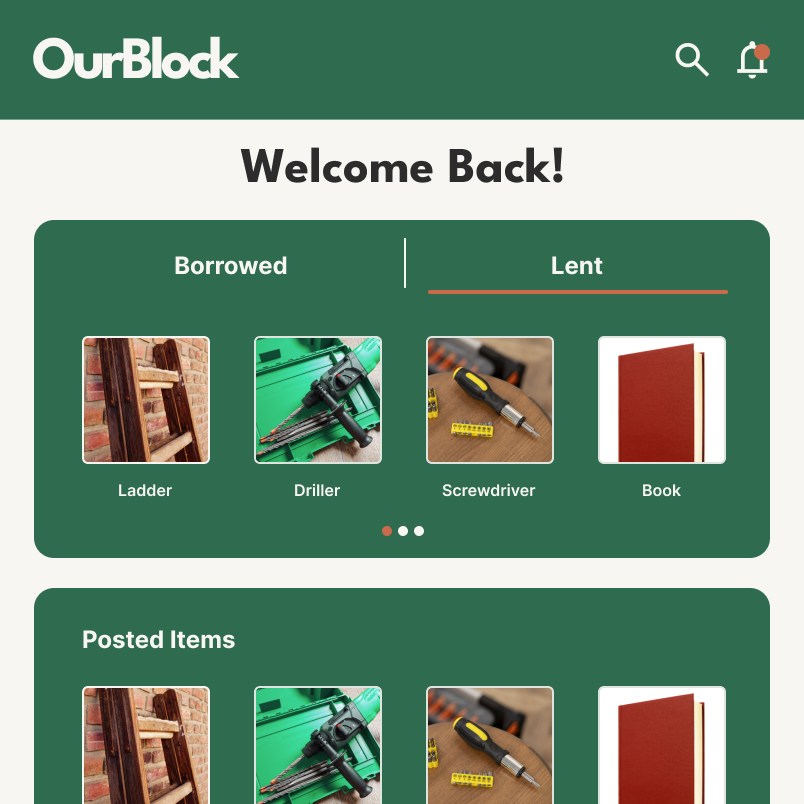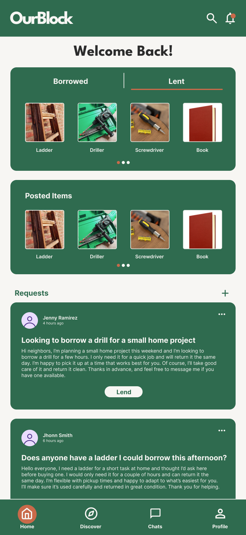 Our Block helped turn everyday objects into shared community resources. By making borrowing visible and socially comfortable, the app reduced unnecessary purchases while encouraging trust and cooperation at a neighborhood scale. Small, repeated acts of sharing strengthened local relationships and helped neighbors see one another as collaborators rather than strangers.