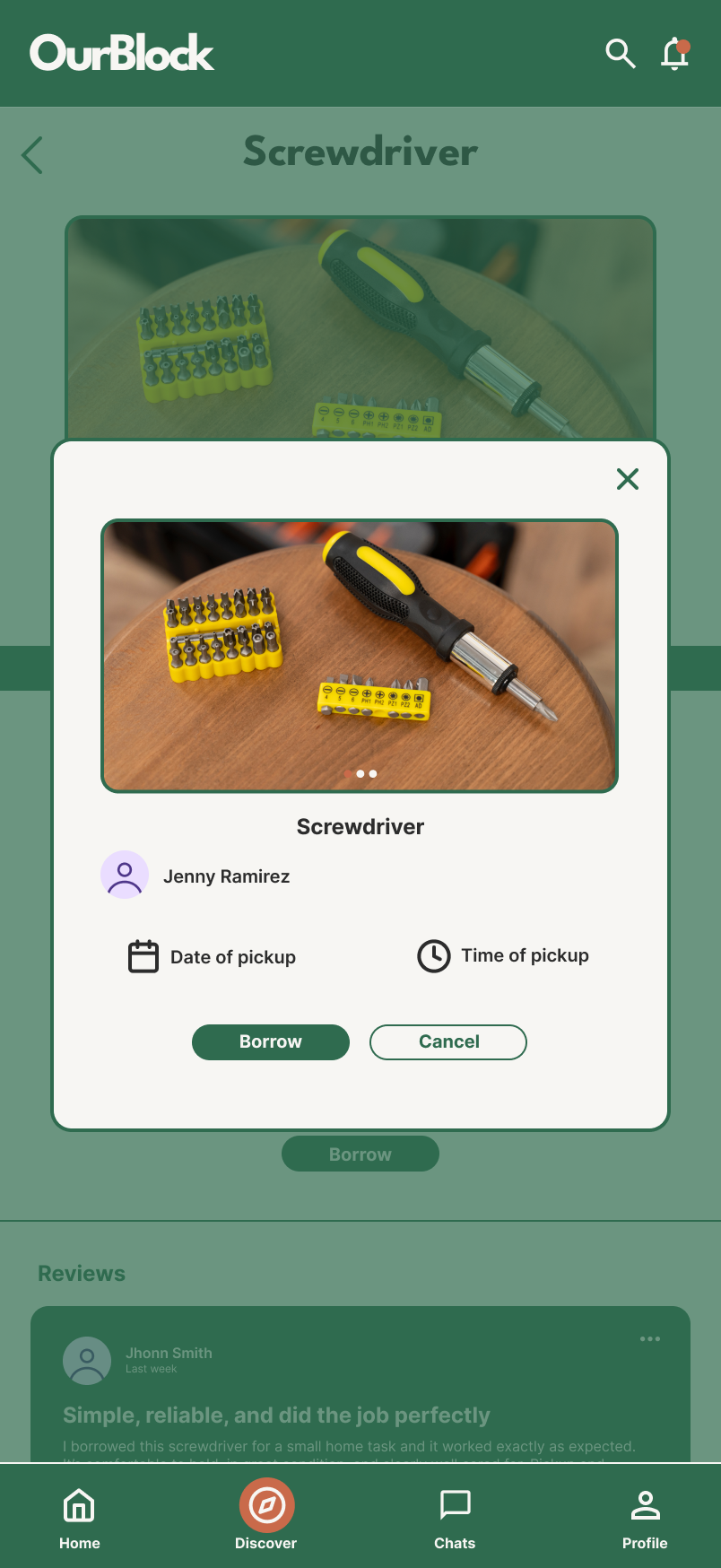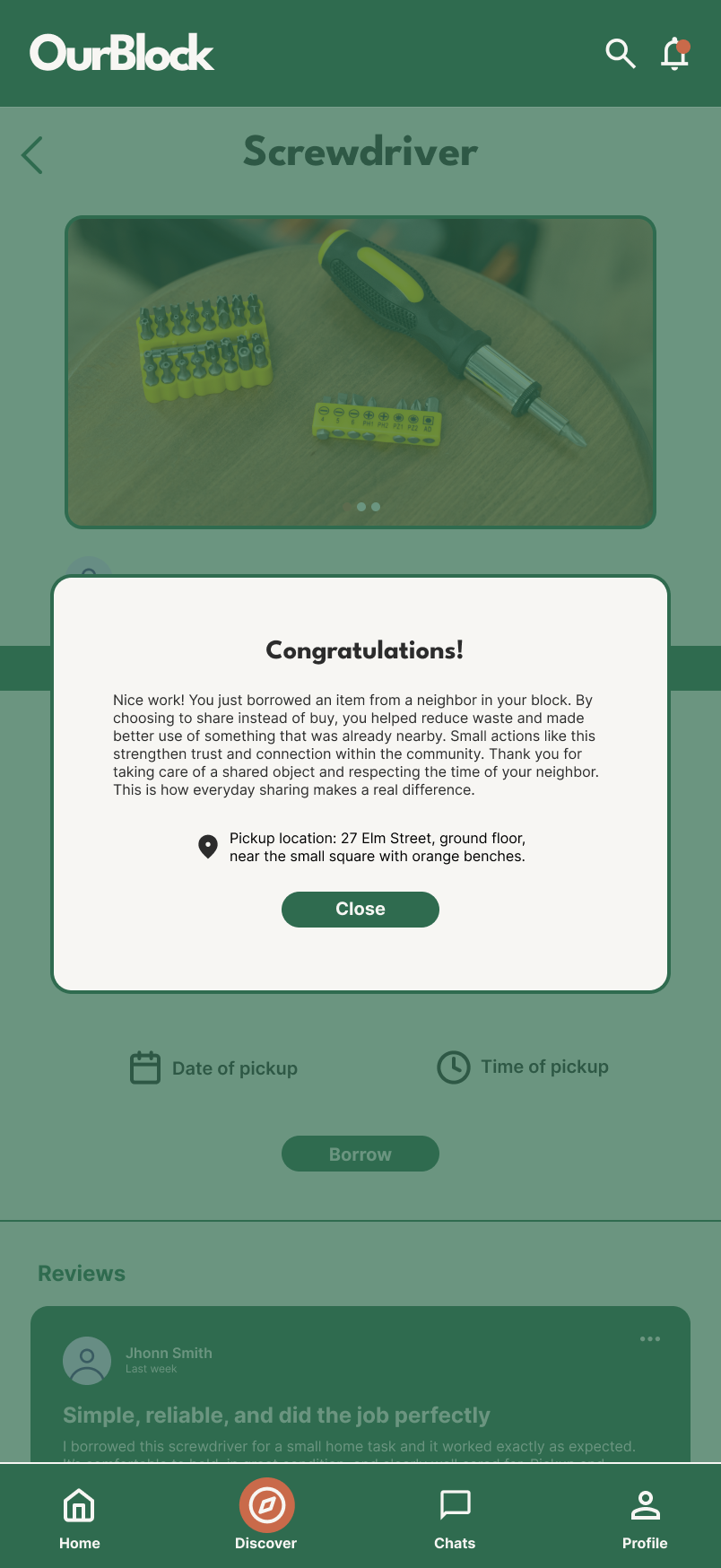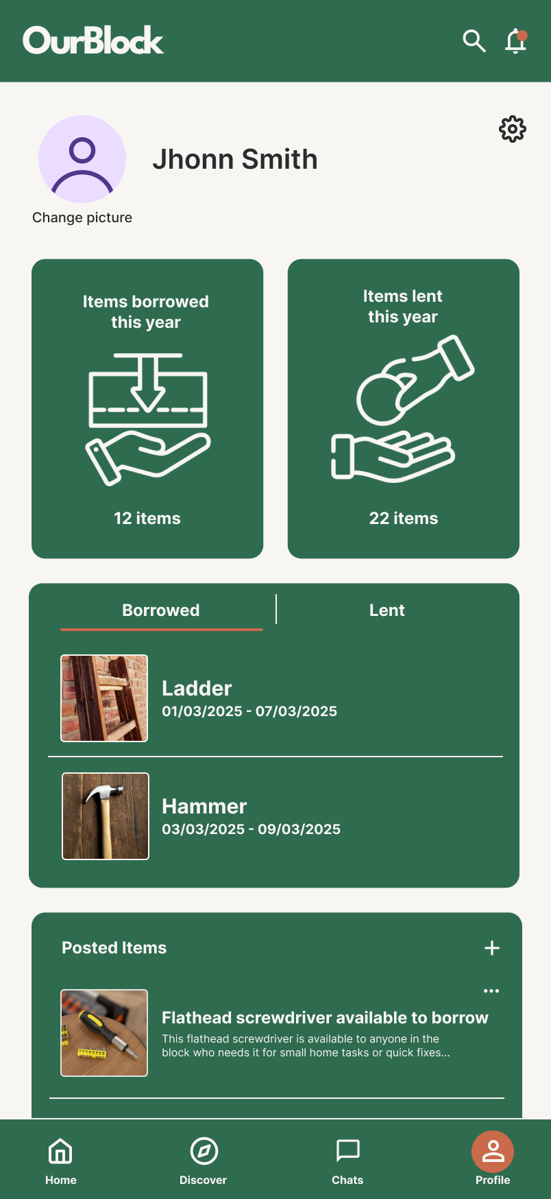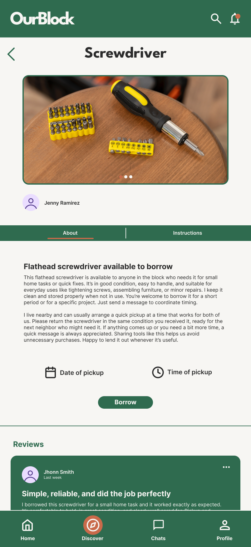 Our Block helped turn everyday objects into shared community resources. By making borrowing visible and socially comfortable, the app reduced unnecessary purchases while encouraging trust and cooperation at a neighborhood scale. Small, repeated acts of sharing strengthened local relationships and helped neighbors see one another as collaborators rather than strangers.
