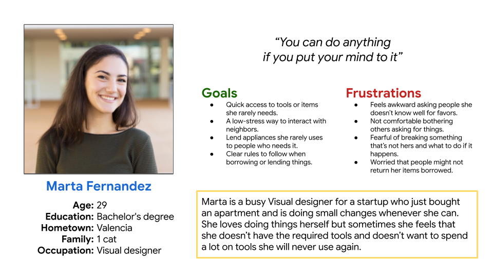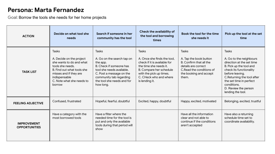 In this user journey map the focus was to find all the challenges Marta faced when finding and acquiring the tools she needs for a small project from a neighbour.