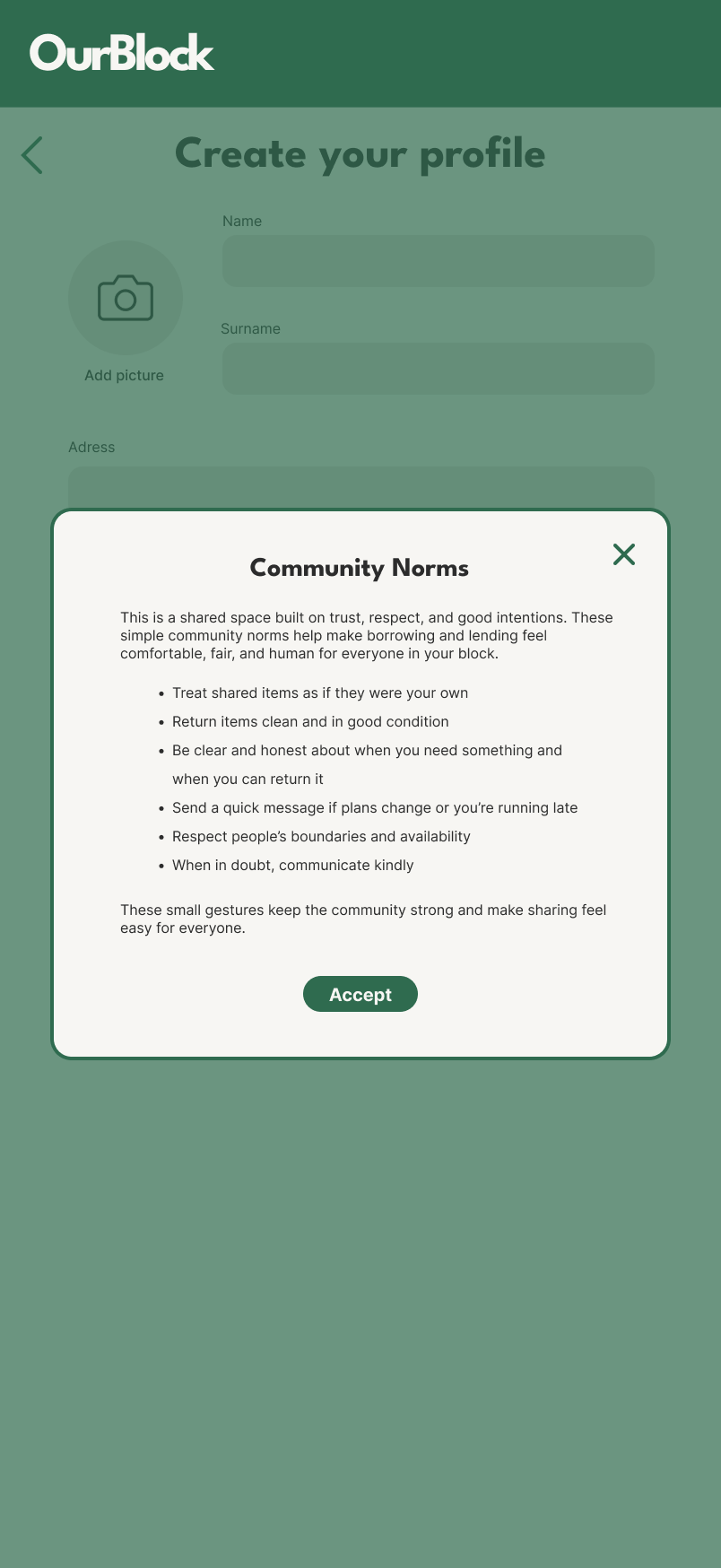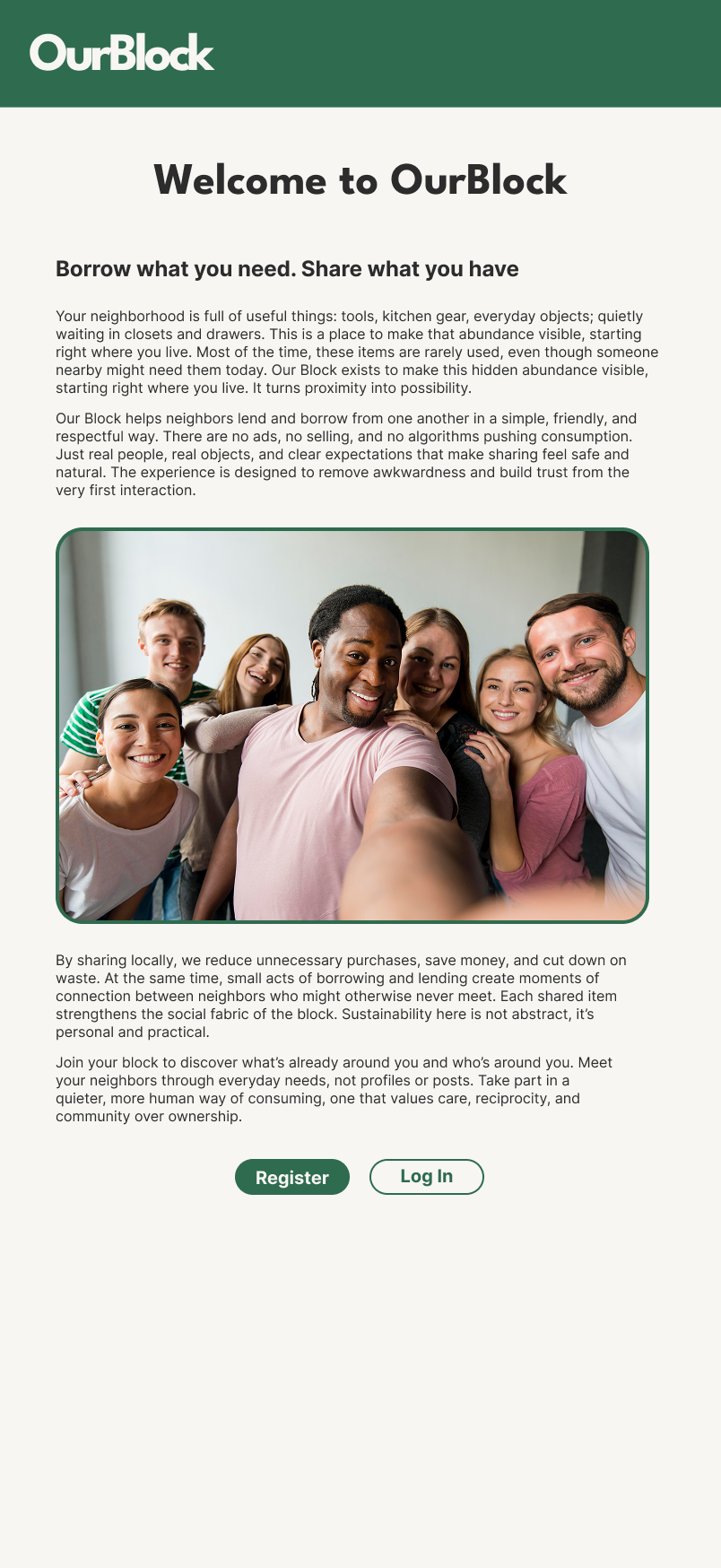 Our Block is a mobile-first, grassroots neighborhood sharing platform that makes borrowing from neighbors feel safe, normal, and joyful. Instead of treating sharing as a transaction, the product frames it as a community ritual — one that reduces overconsumption while strengthening local social bonds. The project reimagines the sharing economy not as a marketplace, but as a social system of mutual care that happens to be mediated by technology.