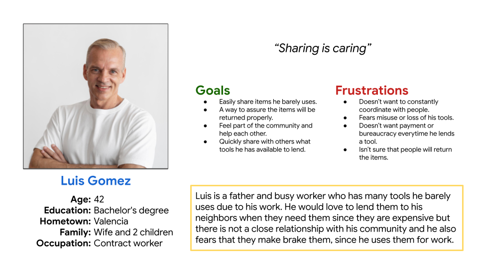 This user journey map focuses on the challenges Luis faces when lending his tools to a neighbour and making sure they are return in good conditions.