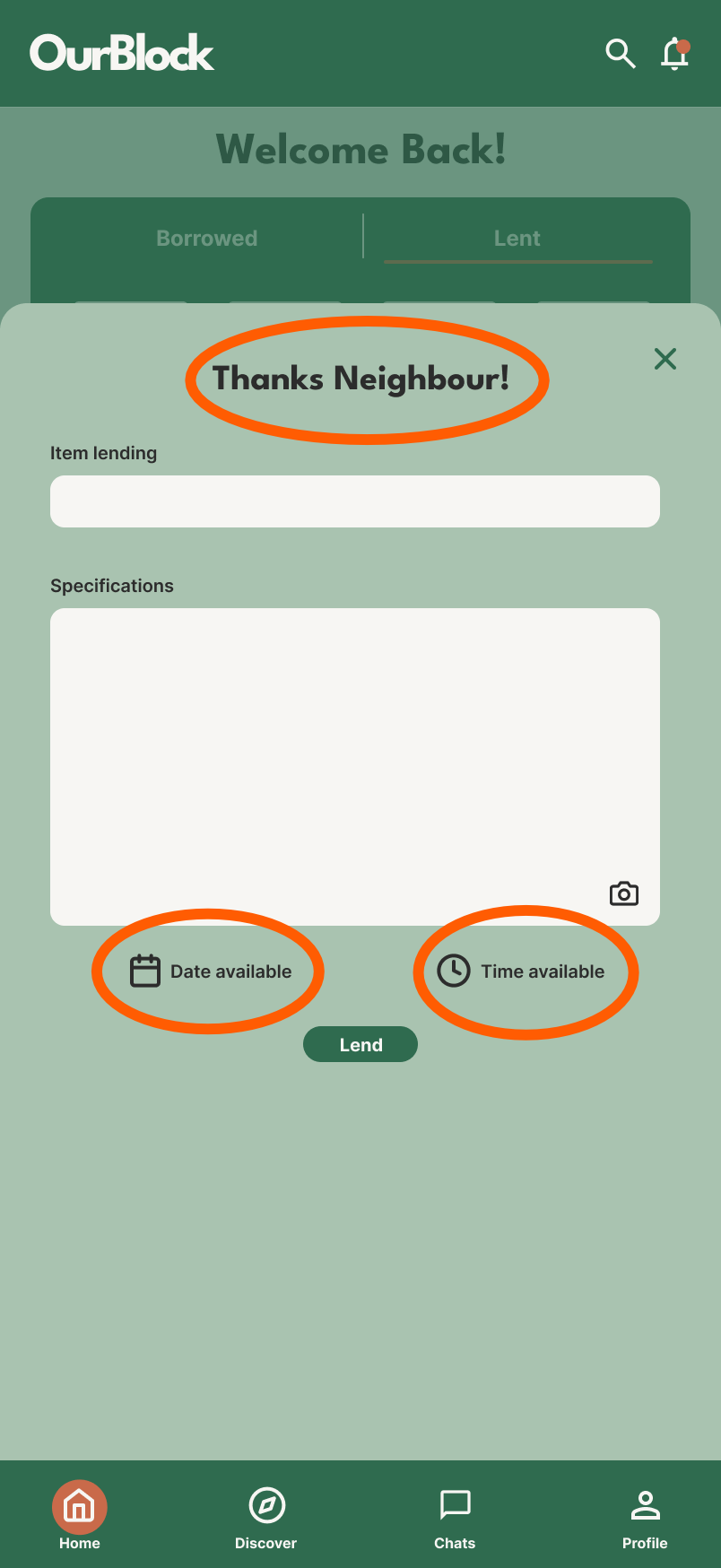 Lend button on the neighbour post and a lend screen specifing the name, pictures and specifications of the item as well as setting date and time available for pickup.
