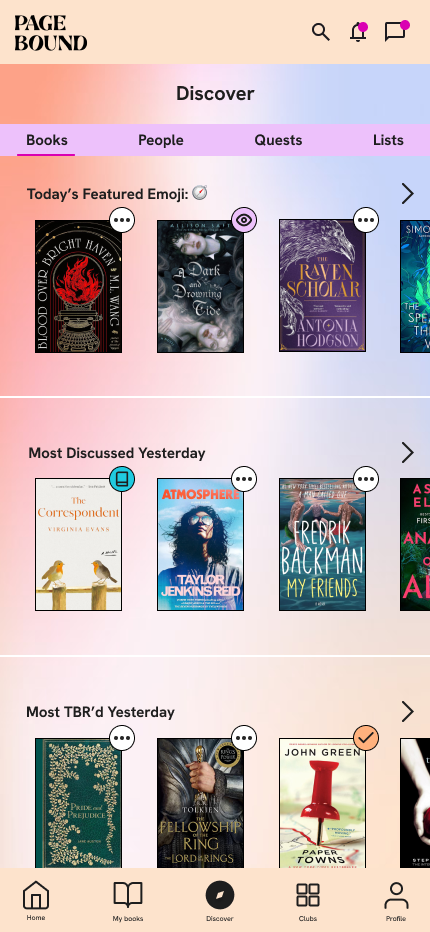 Discover page showing books grouped by different themes, allawing for the discovery of new and unexpected books.