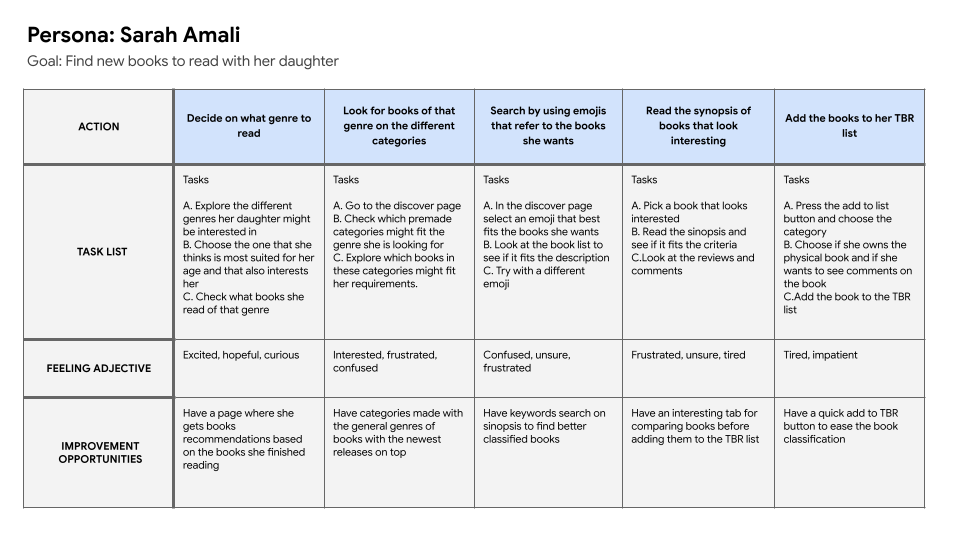 In this user journey map the focus was to find all the challenges Sarah faced when trying to find new books to read, this highlighted the lack of filtering or categorizing of the app.